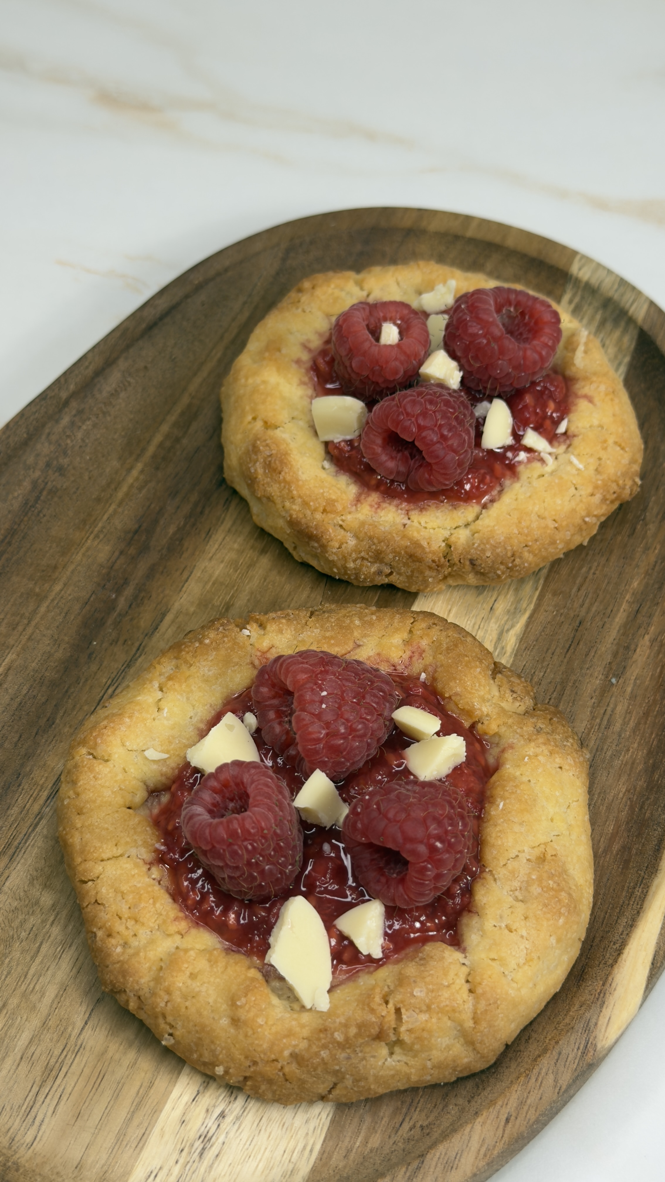 Chocolat blanc, coulis de framboise et framboises.