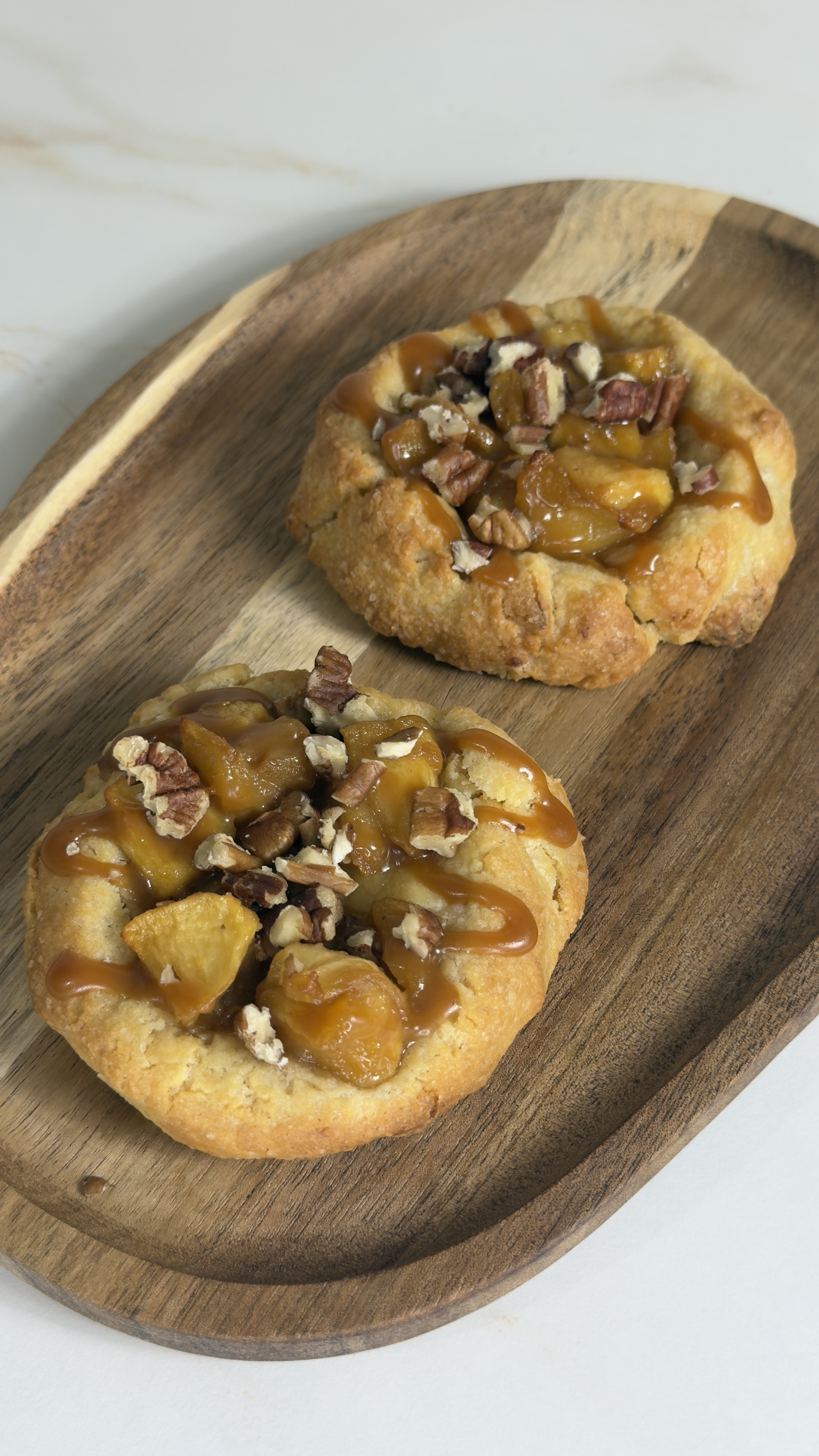 Chocolat blanc, pommes caramélisées, caramel et éclats de noix de pécan.